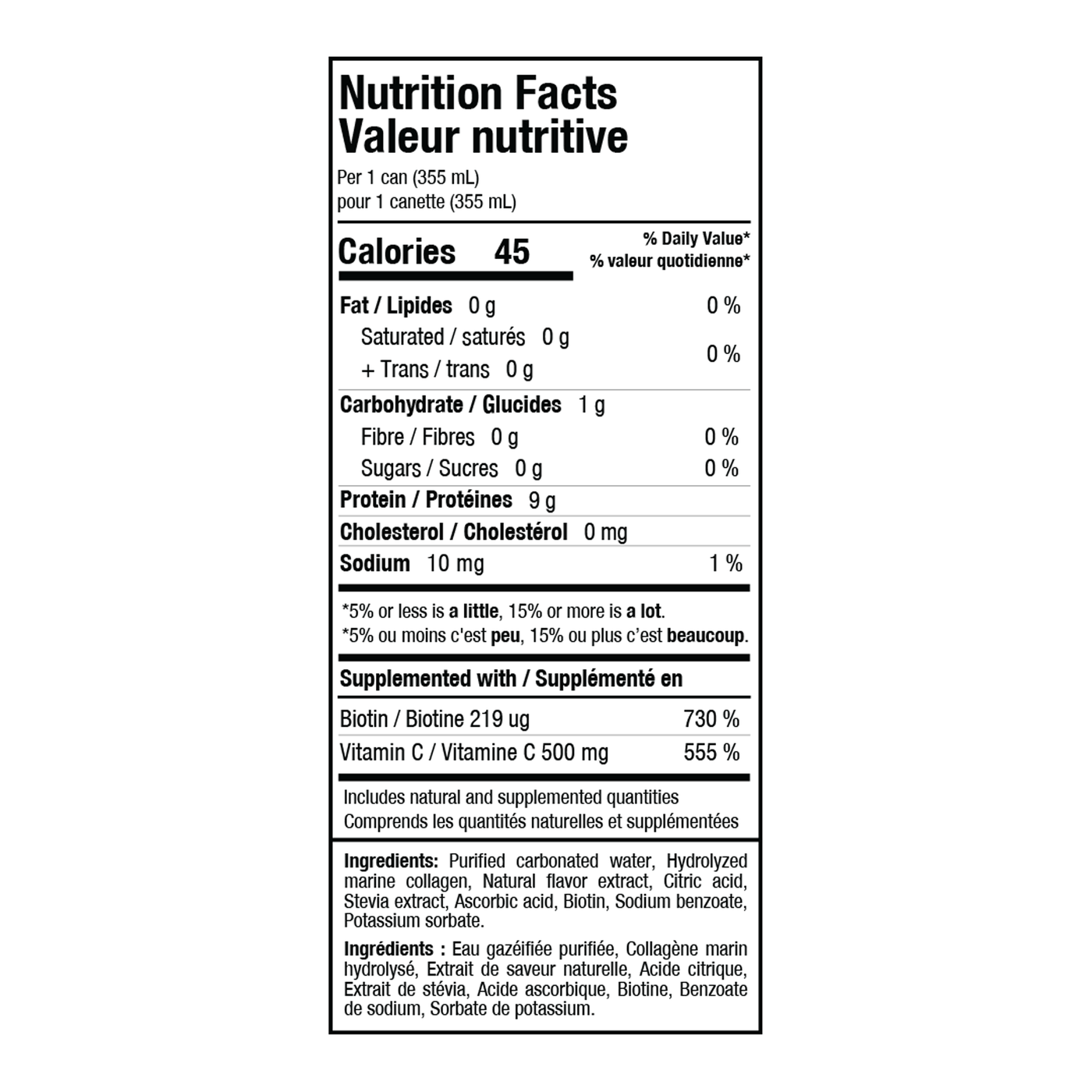 Jouvence est une boisson innovante qui est à la fois délicieuse et qui offre des bienfaits beauté. Chaque canette de 355 ml contient 10 g de collagène marin hydrolysé, enrichi de vitamine C et de biotine, le tout dans une base d'eau osmosée pure. Cette combinaison unique soutient la santé de votre peau, de vos cheveux et de vos ongles, tout en favorisant la santé de vos articulations et de vos os.