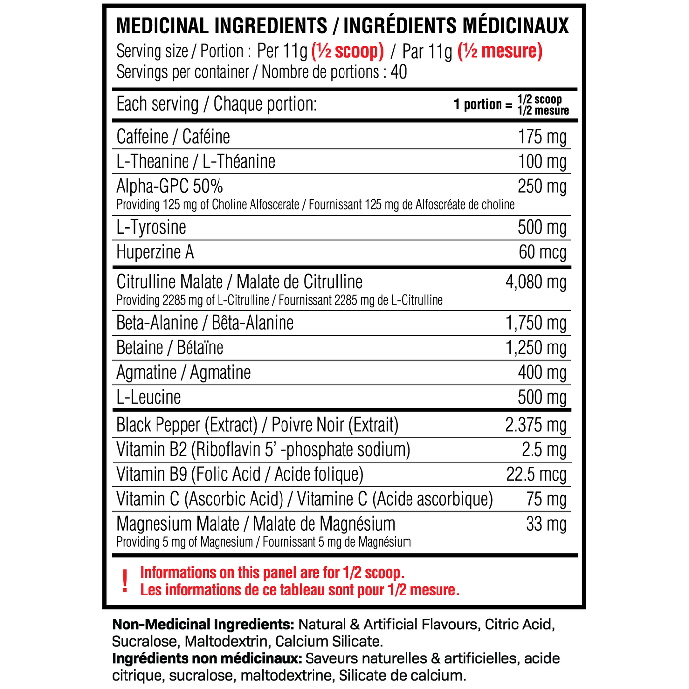 Formulé avec des ingrédients fiables et puissants, comme la L-Citrulline à 8000 mg, la Beta-Alanine à 3500 mg et la Caféine à 350 mg, ce pré-workout favorise une circulation optimale pour maximiser ta pompe musculaire, augmente ta résistance à la fatigue, renforce ta concentration et évite les mélanges inutiles ou les agents de remplissage douteux.
