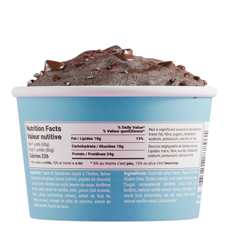 Isolat de lactosérum de qualité pharmaceutique, farine d'avoine, beurre, pépites de chocolat mi-sucré, fruit du moine, miel, yogourt 3 %, lait d'avoine, vinaigre de cidre de pomme, sel marin.