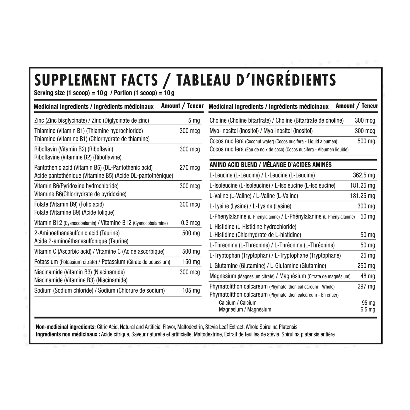 Chaque portion contient un mélange d’ingrédients soigneusement sélectionnés, incluant du potassium, du magnésium, du sodium, du zinc et des vitamines du groupe B. On y retrouve également des acides aminés comme la L-Leucine, la L-Valine et la L-Glutamine, ainsi que des ingrédients d’origine naturelle comme l’eau de coco et la spiruline.