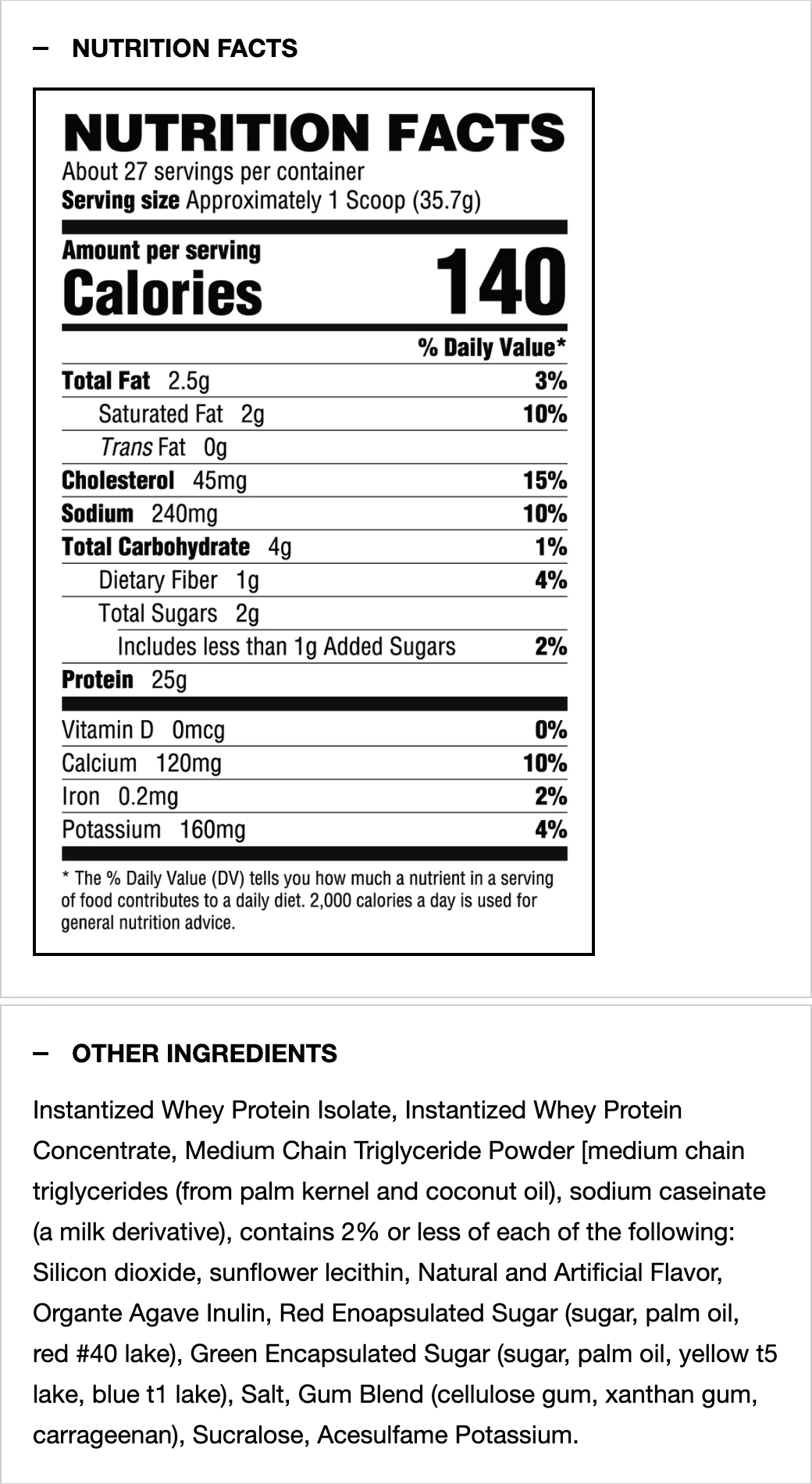 Chaque portion fournit 25 g de protéines de lactosérum, avec l’isolat comme source principale, pour stimuler la croissance et la récupération musculaire. La formule est enrichie en fibres prébiotiques pour la digestion et la santé intestinale, ainsi qu’en MCT (triglycérides à chaîne moyenne) qui soutiennent le métabolisme et apportent une énergie rapidement disponible.