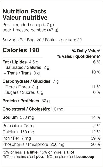 Mélanger une mesure (47 g) avec la quantité d’eau recommandée et consommer après l’entraînement ou à tout moment de la journée pour augmenter l’apport protéique.