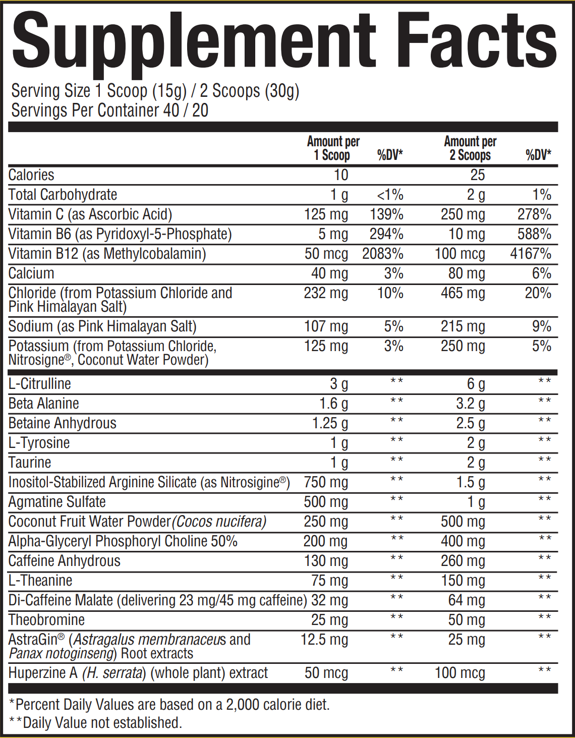 Prepare for explosive energy and intense mental focus that will keep you focused from start to finish. L-Citrulline and Beta-Alanine promote prolonged muscular endurance, while Alpha-GPC and L-Tyrosine complexes sharpen your mind.