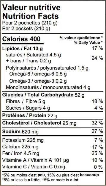 Enjoy a meal rich in fiber, guaranteeing a lasting feeling of satiety, while being an excellent source of animal and vegetable protein. What's more, our recipe is low in sodium, contributing to cardiovascular health by helping to reduce blood pressure. Finally, the complex carbohydrates it contains enable a slow release of energy, avoiding blood sugar spikes and promoting better weight management.