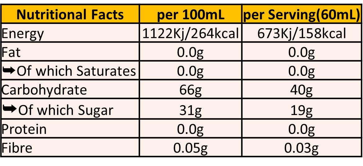 Each 60ml serving provides approximately 40g of carbohydrates and approximately 150kcal , with no fat or protein. It can be combined with other products in the range to adjust electrolyte intake.