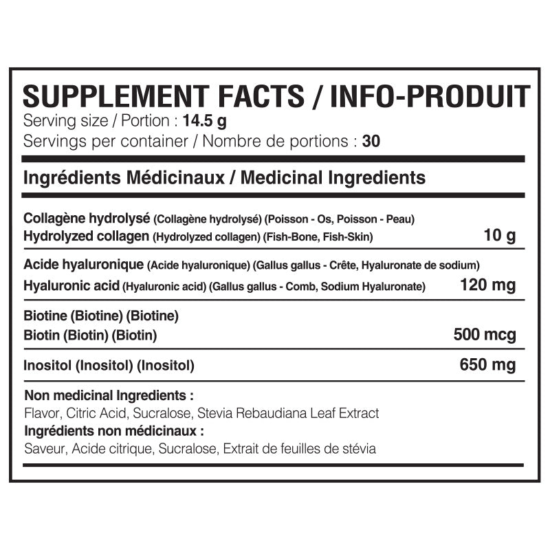 Thanks to its hydrolyzed form, collagen is easily absorbed by the body for optimal effectiveness. Added ingredients, such as biotin, hyaluronic acid and inositol, provide additional health benefits for skin, hair and nails. The variety of flavors makes it easy to integrate into your daily routine, whether in a smoothie, coffee or simply mixed with water.