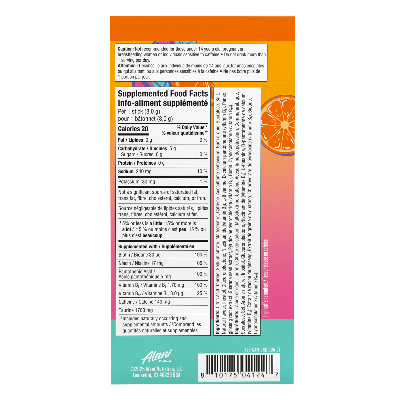 Alani Nu Mélange pour Boisson Énergisante est un mélange énergisant en format pratique à emporter partout. Sa formule associe caféine naturelle, taurine, ginseng, guarana et un complexe de vitamines B pour offrir un véritable coup de boost. Faible en calories, il est sans sucre ajouté, sans gluten et adapté à une alimentation végane.