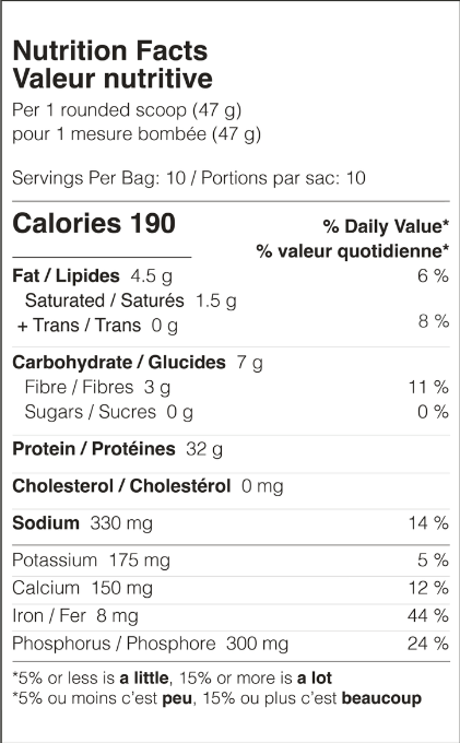 Mélanger une mesure (47 g) avec la quantité d’eau recommandée et consommer après l’entraînement ou à tout moment de la journée pour augmenter l’apport protéique.